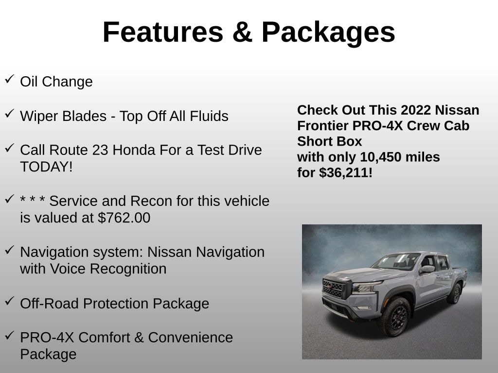 Oil Change, Wiper Blades - Top Off All Fluids, Call Route 23 Honda For a Test Drive TODAY!, * * * Service and Recon for this vehicle is valued at $762.00, 4WD, 120V Power Outlet in Bed, 120V Power Outlet in Rear Center Console, 17" Accessory Dark Beadlock Style Alloy Wheels, 17" Alloy Wheels, 3.692 Axle Ratio, 4-Wheel Disc Brakes, 6 Speakers, ABS brakes, Air Conditioning, All Lava Red Accent Stitching Delete, Alloy wheels, AM/FM radio: SiriusXM, Anti-whiplash front head restraints, Auto High-beam Headlights, Auto-Dimming Mirror, Auto-Tilt & Slide Sunroof w/Manual Shade, Automatic temperature control, Bed Under-Rail Lighting, Blind Spot Warning, Brake assist, Bumpers: body-color, Delay-off headlights, Driver door bin, Driver vanity mirror, Dual front impact airbags, Dual front side impact airbags, Electronic Stability Control, Emergency communication system: NissanConnect Services, Fender Premium Audio System w/10 Speakers, Front & Rear Leather Seat Trim (1st/2nd), Front anti-roll bar, Front Bucket Seats, Front Center Armrest, Front dual zone A/C, Front fog lights, Front reading lights, Front wheel independent suspension, Fully automatic headlights, Heated Front Seats, Heated Outside Mirrors, Heated Steering Wheel, High Beam Assist (HBA), HomeLink UGDO, Illuminated entry, Intelligent Around View Monitor (I-AVM), Intelligent Cruise Control, Knee airbag, Lane Departure Warning System, Leather Shift Knob, Low tire pressure warning, Navigation system: Nissan Navigation with Voice Recognition, Occupant sensing airbag, Off-Road Protection Package, Off-Road Style Step Rails, Overhead airbag, Overhead console, Panic alarm, Passenger door bin, Passenger vanity mirror, Power door mirrors, Power driver seat, Power steering, Power windows, Premium Paint - Boulder Grey, PRO Embroidered Premium Cloth Seat Trim, PRO-4X Comfort & Convenience Package, PRO-4X Illuminated Kick Plates, PRO-4X Mud Flaps, PRO-4X Premium Package, Radio data system, Radio: SXM/AM/FM/AUX/USB Audio System w/6 Speakers, Rear anti-roll bar, Rear Automatic Braking (RAB), Rear Cross Traffic Alert (RCTA), Rear seat center armrest, Rear Sonar System, Rear step bumper, Remote Engine Starter, Remote keyless entry, Security system, Speed control, Speed-sensing steering, Split folding rear seat, Spray-In Bedliner, Steering wheel mounted audio controls, Tachometer, Technology Package, Tilt steering wheel, Traction control, Traffic Sign Recognition (TSR), Trailer Hitch w/Wiring Harness, Trip computer, Unique Premium Center Console Stitching, Unique Premium Door Trim, Utili-Track System, Variably intermittent wipers, Voltmeter, Wireless Charging For Personal Devices. Odometer is 13549 miles below market average! Clean CARFAX. CARFAX One-Owner.